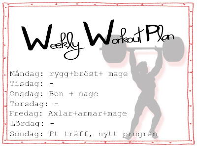 PT TRÄFF! Och nya träningsprogram kommer jag att få. Istället för 3 delat är de nu uppdelat i 5 delar, vilket betyder att axlar, armar, rygg och bröst får egna program. +benen då förstås. Taggad var ordet! :)